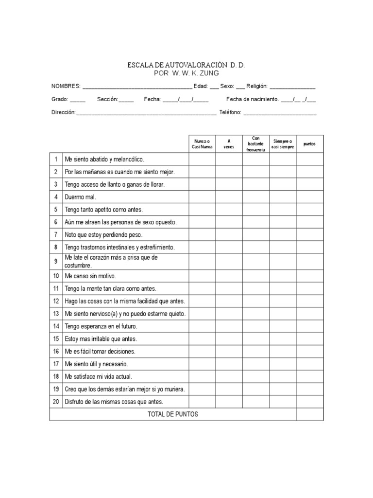 Cuestionario Zung. Los formatos que se usaron, tanto en la escala de zung, como en el cuestionario para pastores, contienen en total 67 cuestiones. Es un cuestionario que evalúa tanto aspectos cualitativos como cuantitativos de la calidad del sueño en el mes previo a la aplicación del mismo.