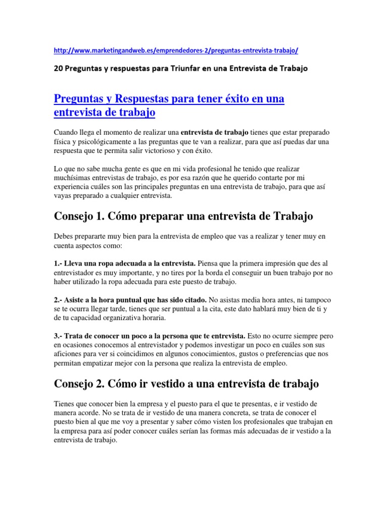 Preguntas Y Respuestas Para Una Entrevista De Trabajo. Que la entrevista de trabajo vaya bien, depende de tu comportamiento y las respuestas que des a las preguntas que te planteen en la misma. 5 agosto, 20205 agosto, 2020.