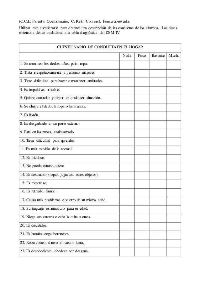 Un portal online en el que los profesionales de fundación cadah darán respuestas a todas tus dudas y te ofrecerán soporte en todo momento de forma fácil, directa y. .y cuestionarios dirigidos a recoger información de los profesores para la evaluación del tdah. Un cuestionario es un conjunto de preguntas que se confecciona para obtener información con algún objetivo en concreto. Escalas e/ou cuestionarios que poden achegar información sobre os síntomas característicos do tdah.