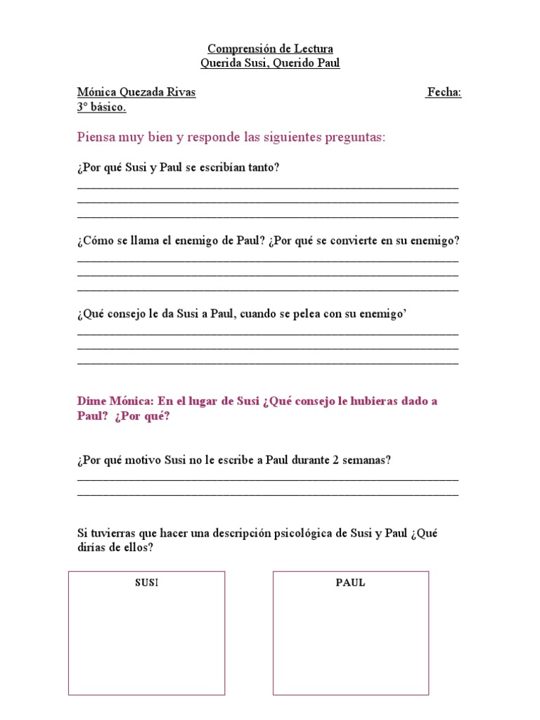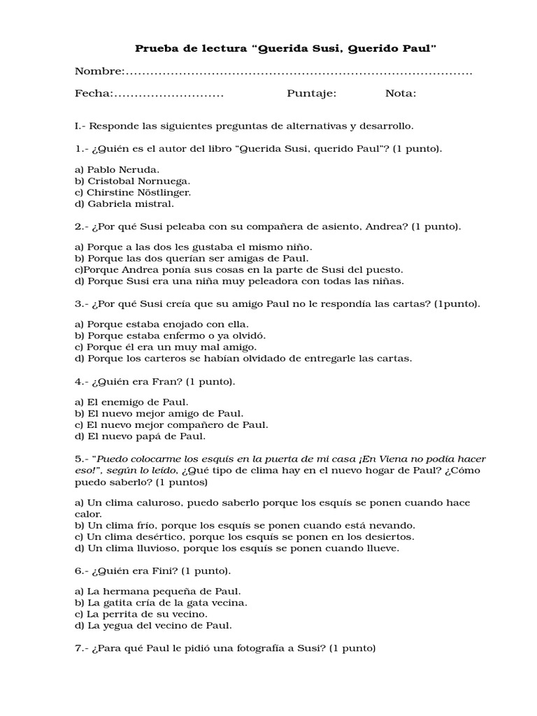 Preguntas De Prueba Libro Querida Susi Querido Paul. Responde las siguientes preguntas encerrando en un círculo la alternativa correcta. Prueba de lectura complementaria querida susi, querido paul.