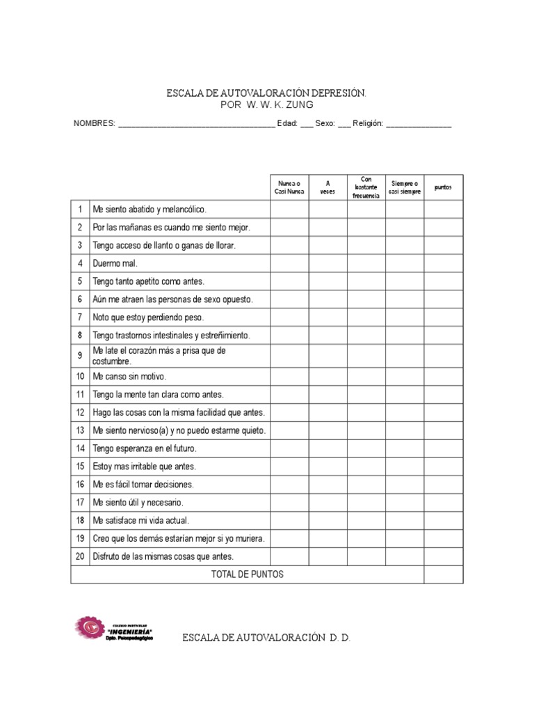 Cuestionario Zung Ansiedad. Un marco de referencia de las conductas ansiosas, basado en un cuestionario de. La escala de ansiedad de zung (zas), comprende un cuestionario con 20 situaciones relacionadas con la manifestaciones características de ansiedad como síntoma o signo.