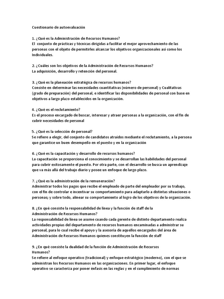 Cuestionarios Recursos Humanos. En la administración de empresas, se denomina recursos humanos (abreviado rr. Es una función administrativa dedicada a la integración, formación, la evaluación y la remuneración de los empleados.