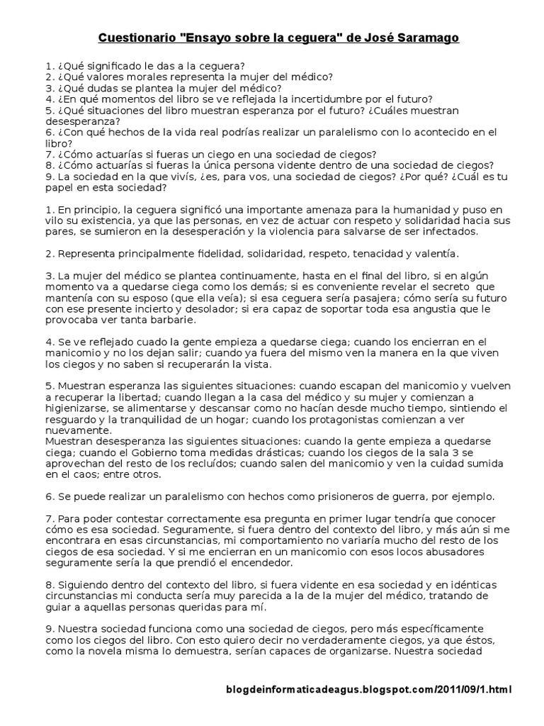 Preguntas De Prueba Ensayo Sobre La Ceguera. Descripción física y psicológica de siete personajes del libro 1. La guía de estudio de ensayo sobre la ceguera contiene una biografía de saramago, ensayos literarios, cuestionarios, temas principales, personajes y un resumen y análisis completo.
