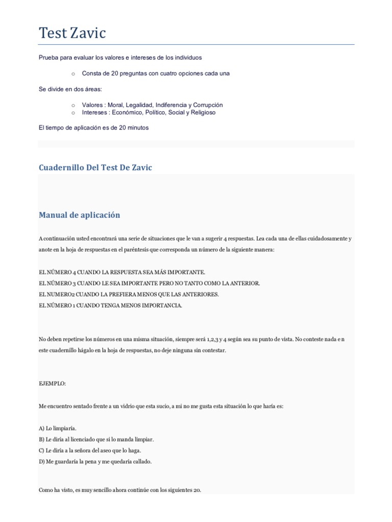 Te revelo y desenmascaro, el test completo, el cuestionario, como debes manipularlo, lo que mide, lo que te califican los de recursos humanos. El test zavic está formado por un cuestionario de 20 preguntas, cada una de ellas posee 4 alternativas desde donde se podrá sacar la respuesta, el participante solo debe elegir una de las. Aplicar zavic introducir respuestas zavic ver resultados zavic ver respuestas zavic ver reporte zavic. El test zavic se divide en dos áreas: