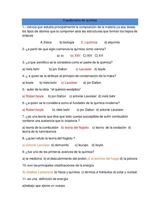 Cuestionarios Química. Es todo proceso en el cual una más sustancias se transforman, cambiando su estructura molecular sus enlaces, en. Un cuestionario es una herramienta de investigación que consiste en una serie de preguntas y otras indicaciones con el propósito de obtener información de los consultados.