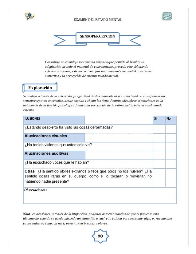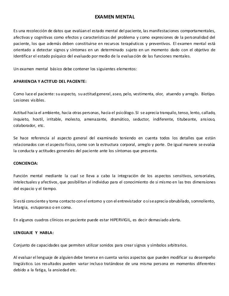 Protocolo Examen Mental from image.slidesharecdn.com So please help us by uploading 1 new document or like us to download L'examen mental est utile à l'évaluation objective de la pensée et se trouve à être l'équivalent psychiatrique de l'examen physique. Learn vocabulary, terms and more with flashcards, games apartado del examen mental en el que se valora produccion, forma, curso y contenido cognitivo.