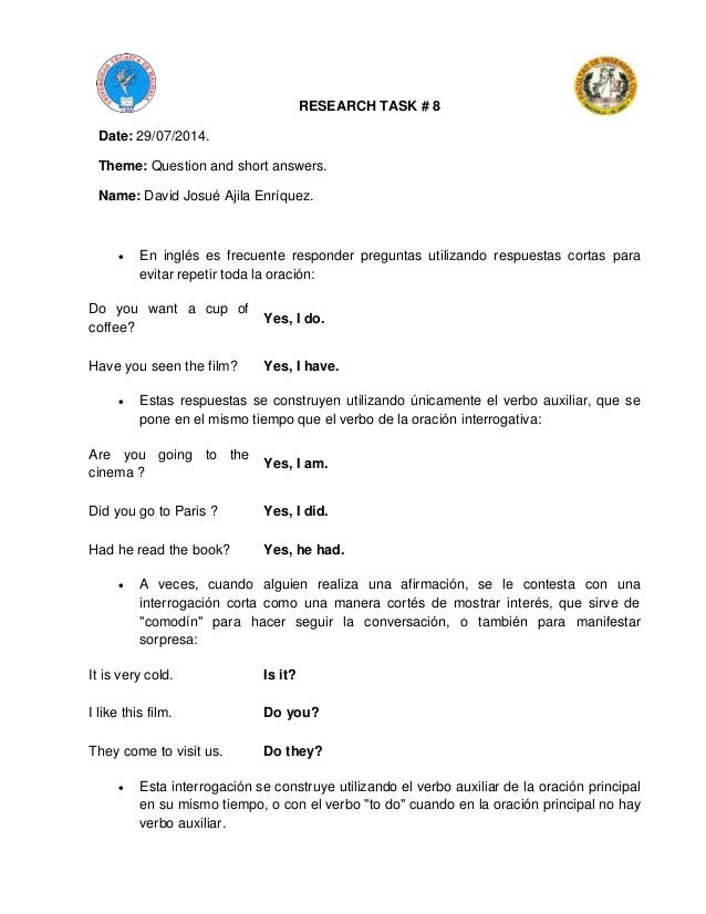 Question And Short Answers from image.slidesharecdn.com Dentro de las llamadas preguntas de comportamiento, ésta es sin duda una de las más comunes. Las respuestas cortas afirmativas en presente simple se forman con yes (si) seguido de una coma, el sujeto y do (para los pronombres: Las respuestas de la entrevista de trabajo en inglés no suelen ser cortas, ya que es una entrevista en la que se debe demostrar el nivel de dicho.