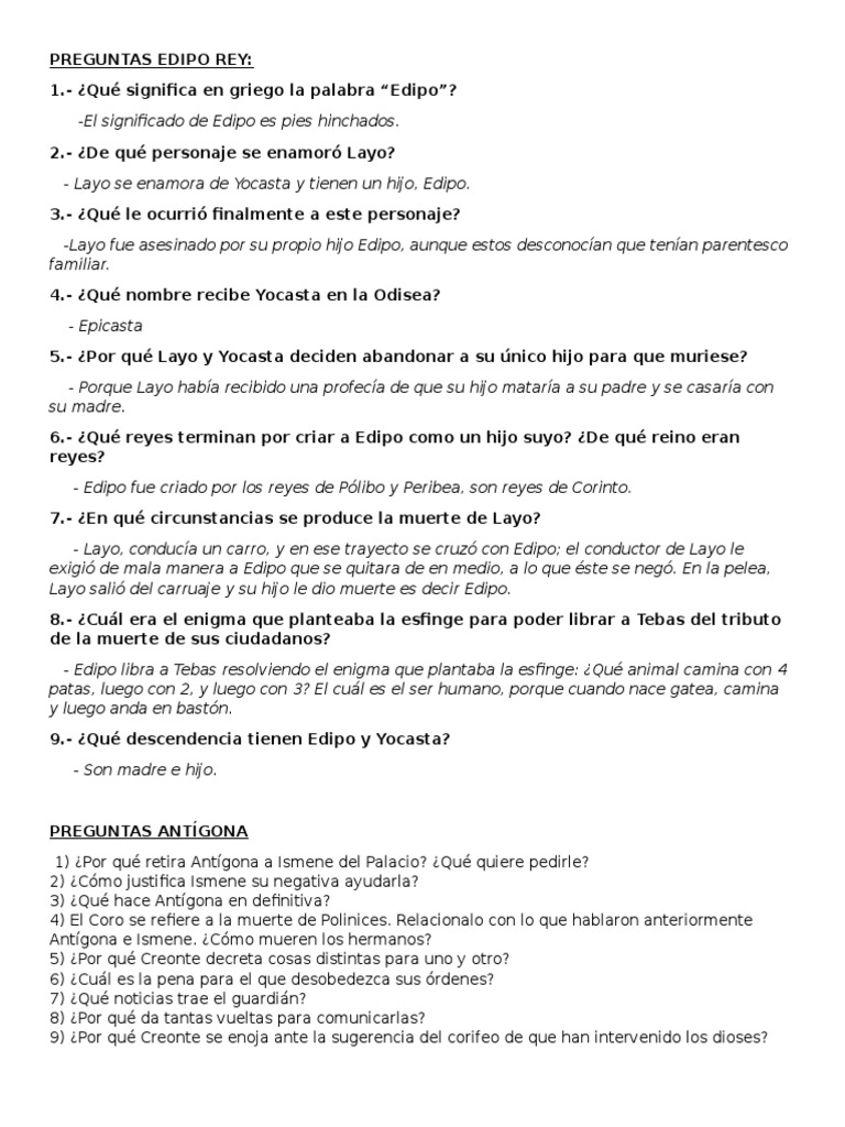 Preguntas Y Respuestas De Edipo Rey. Pregunta acerca de tu tarea. Edipo se da cuenta de que el pronóstico de apolo no había fallado, a pesar de todas las precauciones que él había tomado para evitarlo, como no volver a ver a sus.