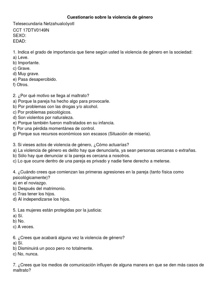 Cuestionarios Violencia De Genero. B) slo hay que denunciar si la pareja es cercana a. 1.a menudo su pareja ignora los sentimientos de usted.