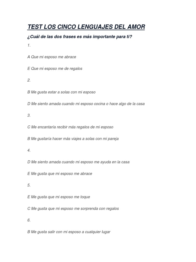 Cuestionario 5 Lenguajes Del Amor. Los lenguajes del amor se refieren a entender la forma en que las personas les gusta demostrar y que les demuestren el amor. Deben haber identificado su lenguaje primario y secundario.