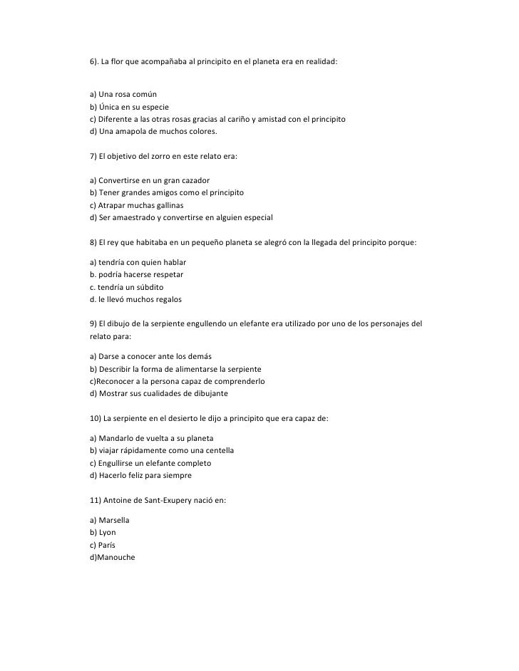 Preguntas De Examen Sobre El Principito. Nacio el 30 de julio de 1900 en francia. Y un volcn apagado le serva de taburete.