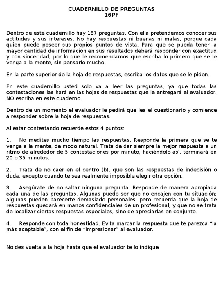 Preguntas De La Prueba 16Pf. Test de nacionalidad española número 2 prueba este examen de nacionalidad completamente.el control de la acción del gobierno corresponde a las cortes generales. No, ninguna respuesta que se consigne en el cuadernillo.