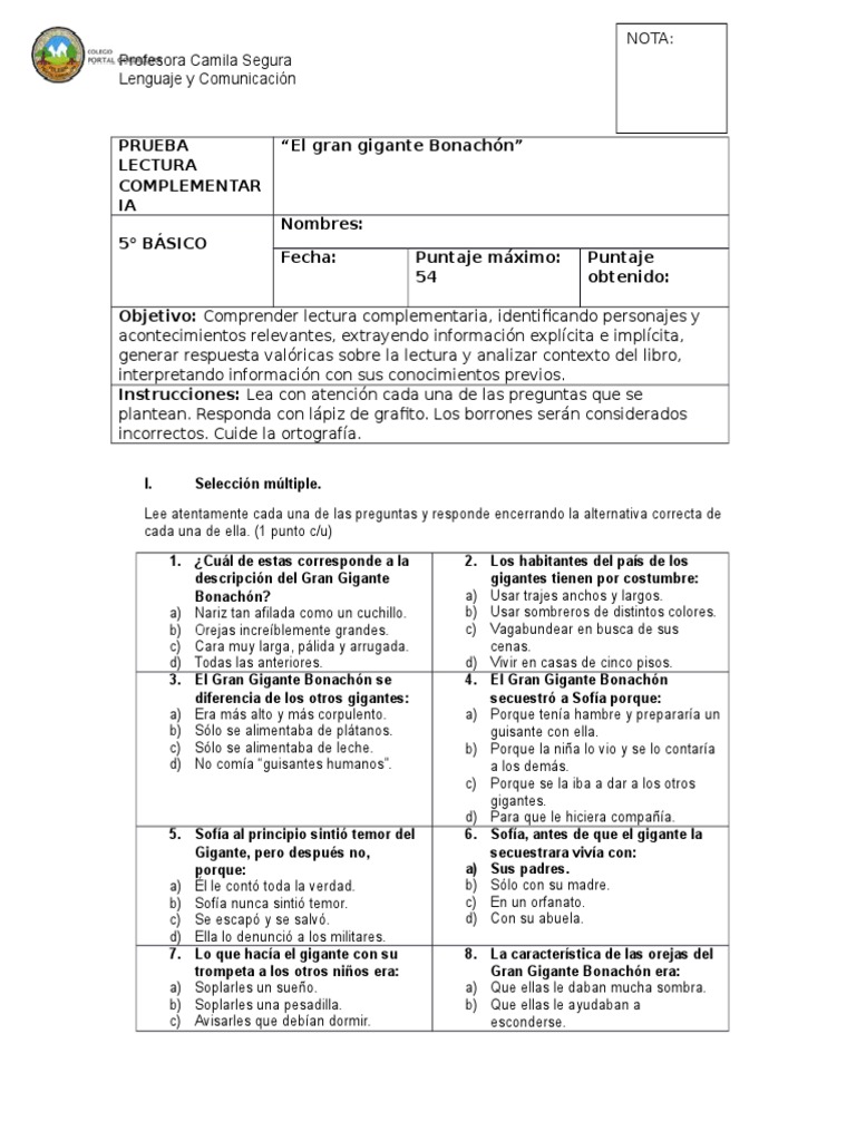 Preguntas De Prueba El Gigante Bonachon. El gran gigante bonachón selección múltiple: El gigante bonachón es un cuento corto basado en el cuento de roald dahl titulado 'el gran el gigante bonachón, un cuento fantástico para niños.