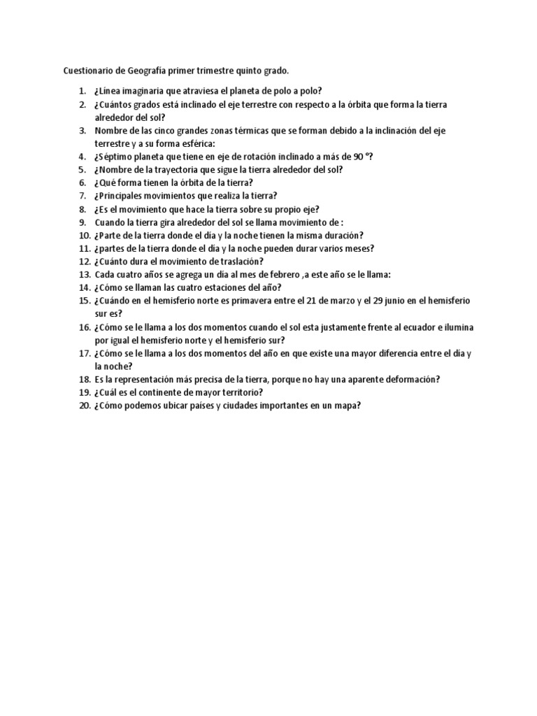 Quinto Grado Cuestionarios De Geografia. La geografía se divide en dos ramas principales, a saber: Cuestionario de geografía del primer trimestre de quinto grado.