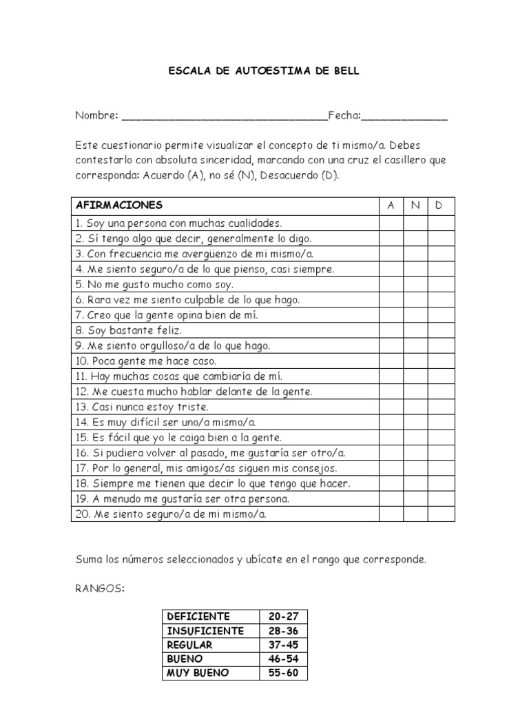 Cuestionario para explorar la autoestima personai entendida como los sentimientos de valia menos de 25 puntos: