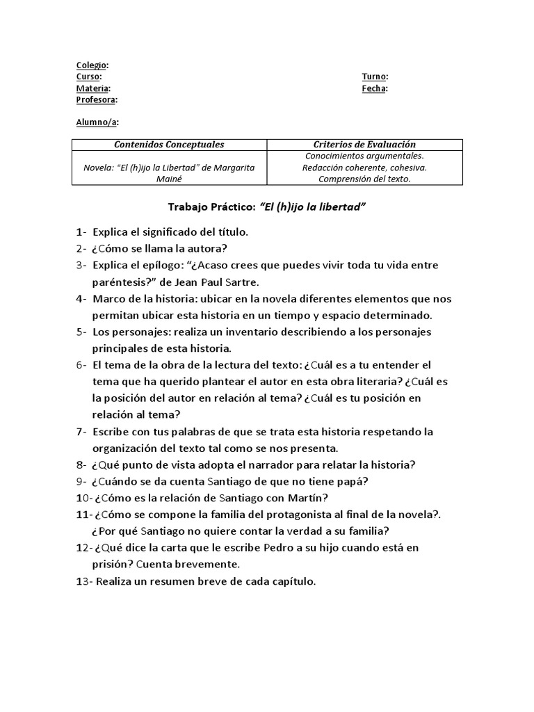El (H)Ijo La Libertad Preguntas Y Respuestas. El (h)ijo la libertad es una novela escrita por la escritora argentina margarita mainé. Le dije que estudiaría con francisco y que iba a volver a casa a las seis de la tarde.
