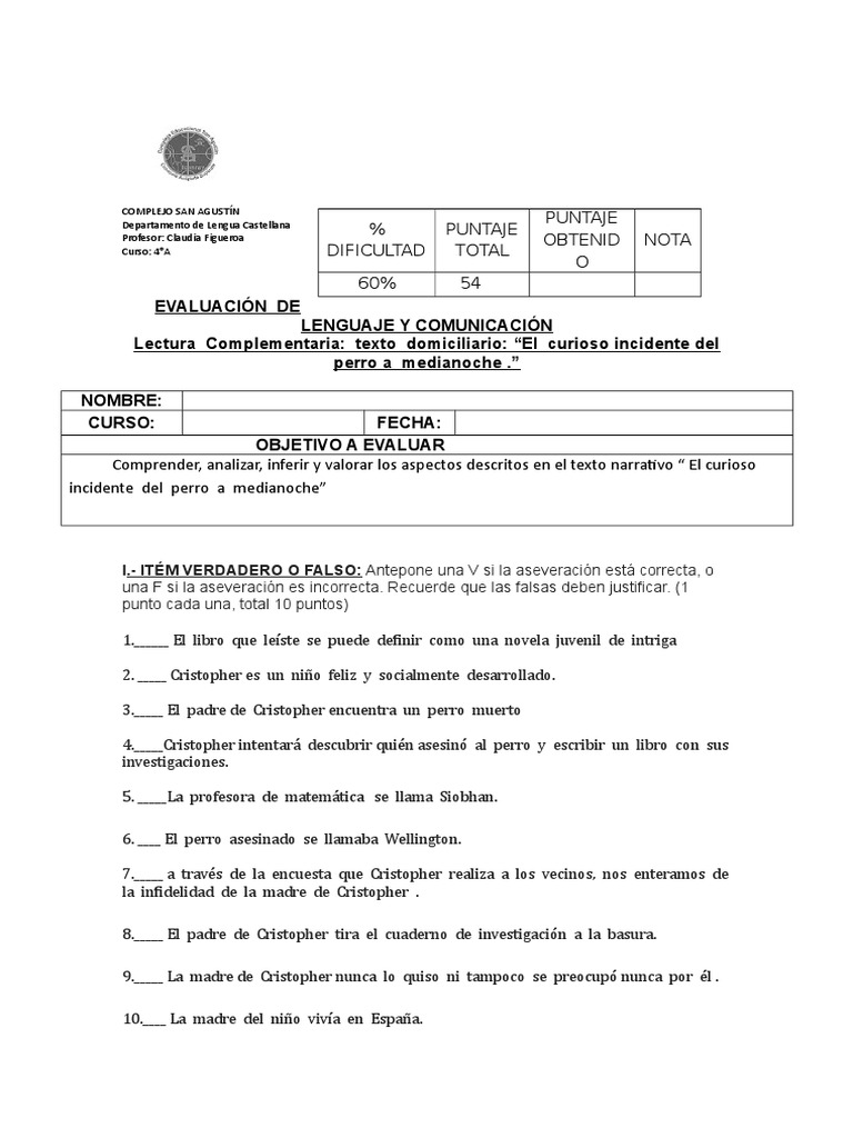 Control De Lectura Complementaria El Curioso Incidente Del Perro A Medianoche Examen Seroja100