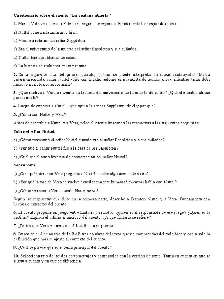 Marca V de verdadero o F de falso según corresponda. F Su hermana había vivido ahí hacía cuatro años pero él no conocía el lugar b Vera era sobrina del. Pauta de Comprensión de lectura La ventana abierta Respecto de La ventana abierta de Saki.