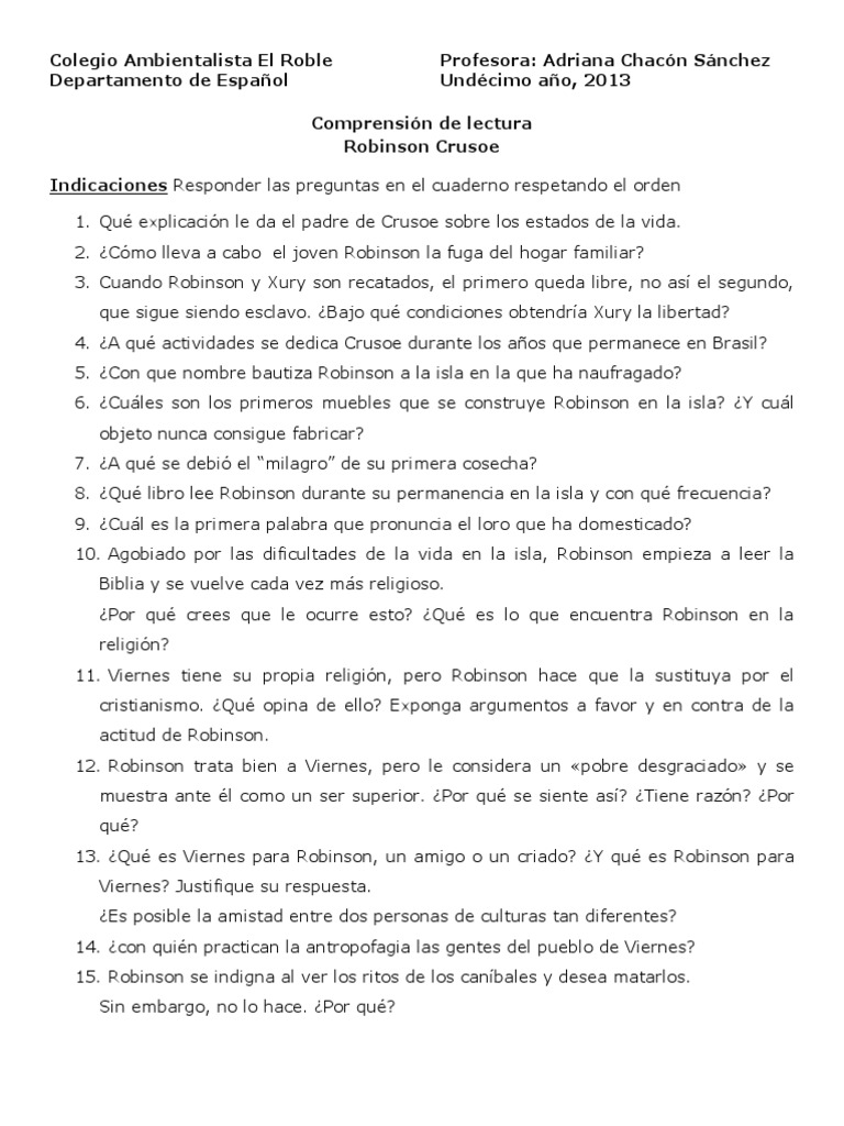 Comprension De Lectura Robinson Crusoe Pdf Robinson Crusoe Religion Y Creencia