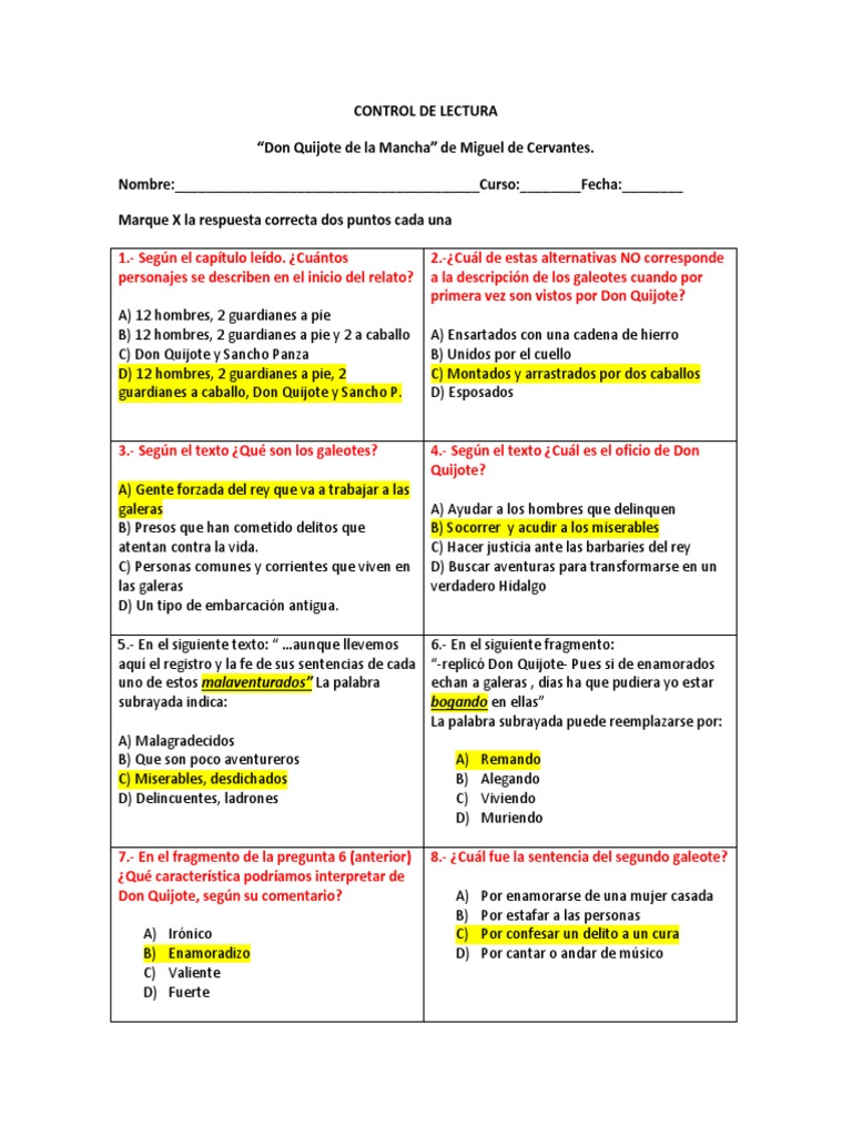 Don quijote preguntas y respuestas por capitulos. Qué historia le inventa Sancho a don Quijote sobre la entrega de la. Cómo se describe a Don Quijote. Start studying Don Quijote de la Mancha las preguntas de capítulos 1-4.