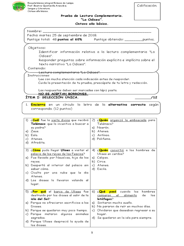 Prueba Lectura Complementaria La Odisea 8 Martes 25 De Septiembre Pdf Odiseo Odisea