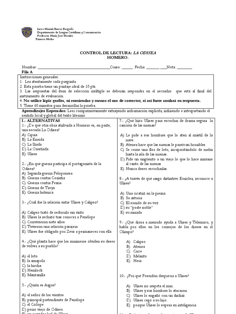 Prueba De La Odisea 2013 1 Medio Fila A Odiseo Odisea